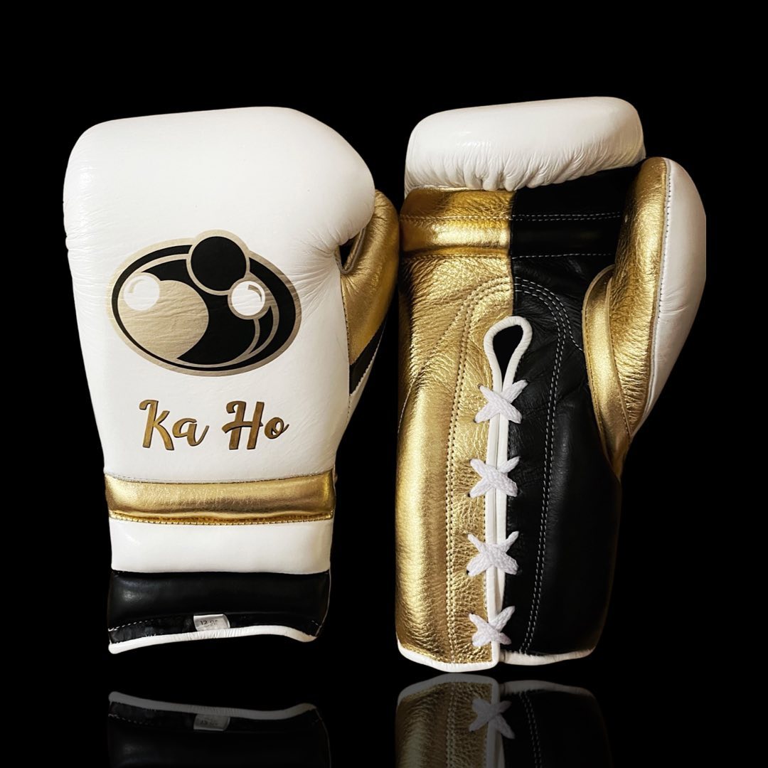 Grant Ka Ho White Gold Boxing Gloves with Black Contrast Panels