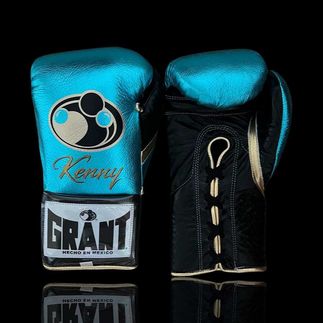 Grant Gold & Sky Blue Lace-Up Boxing Gloves – Metallic Professional Fight Edition