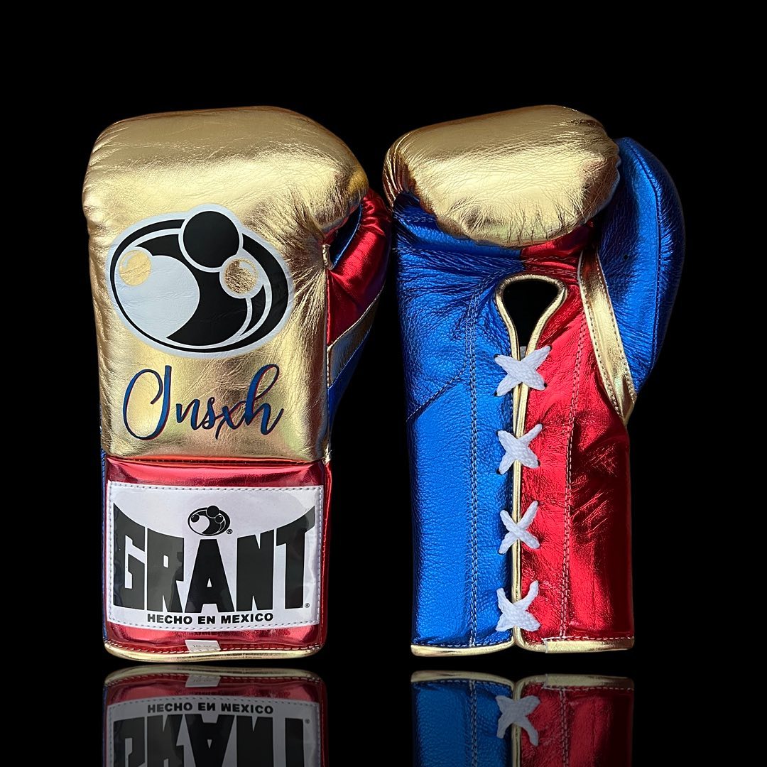 Grant Metallic Gold, Blue & Red Lace-Up Boxing Gloves – Premium Fight Gear