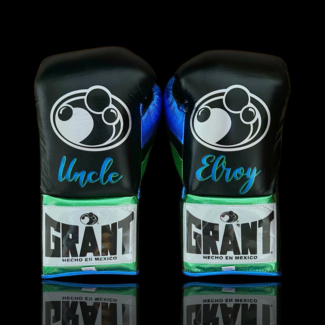 These Grant boxing gloves present a striking blend of bold colors and professional craftsmanship. The deep black base is complemented by energetic blue and green accent panels, creating a sharp and dynamic look. A traditional lace-up closure provides a firm and stable wrist fit for controlled movement. Soft internal cushioning helps absorb impact while maintaining comfort throughout intense training routines. The smooth exterior finish and detailed stitching reflect careful construction and reliable performance. Designed for athletes who appreciate standout style and dependable support in every session.